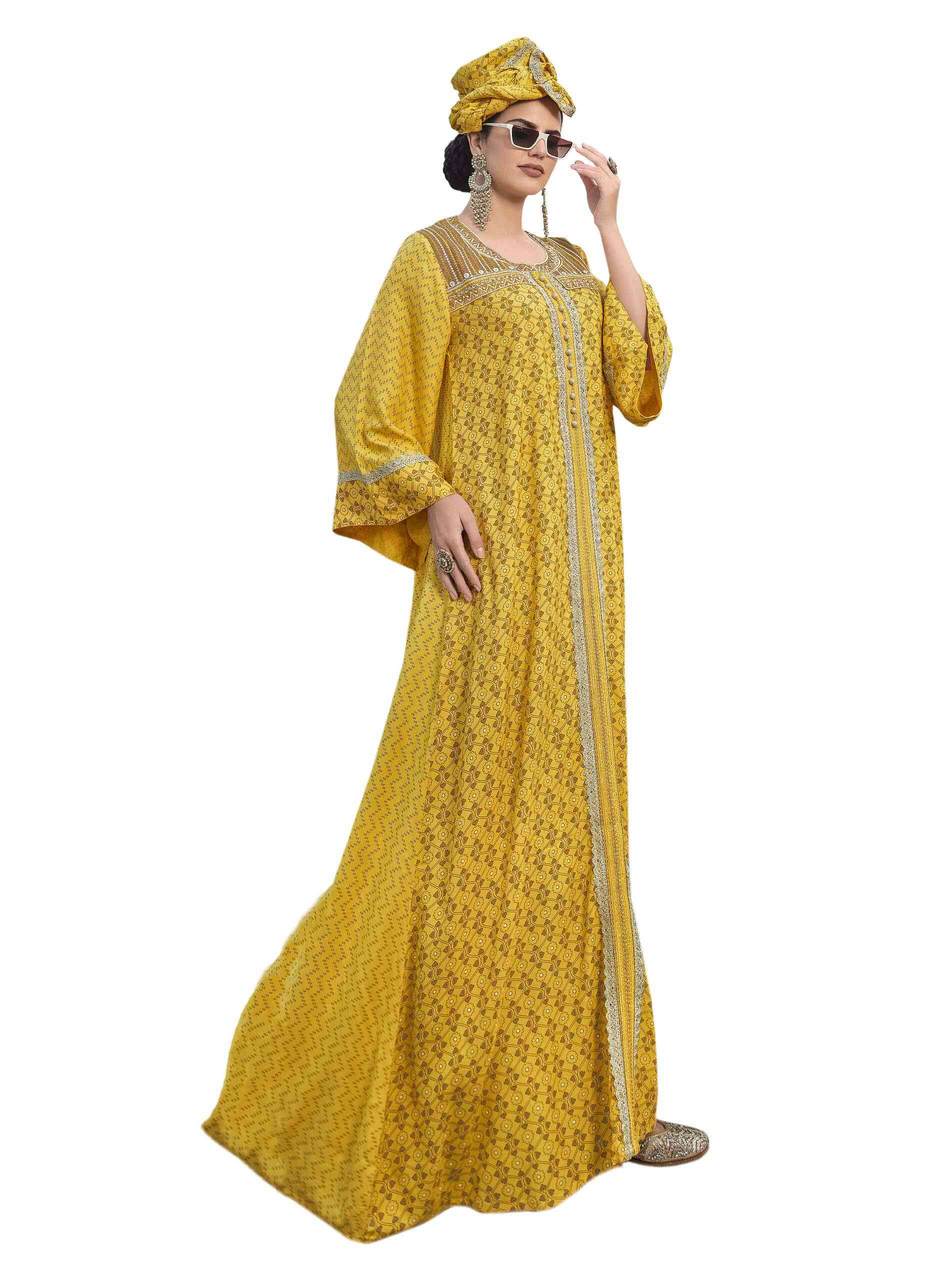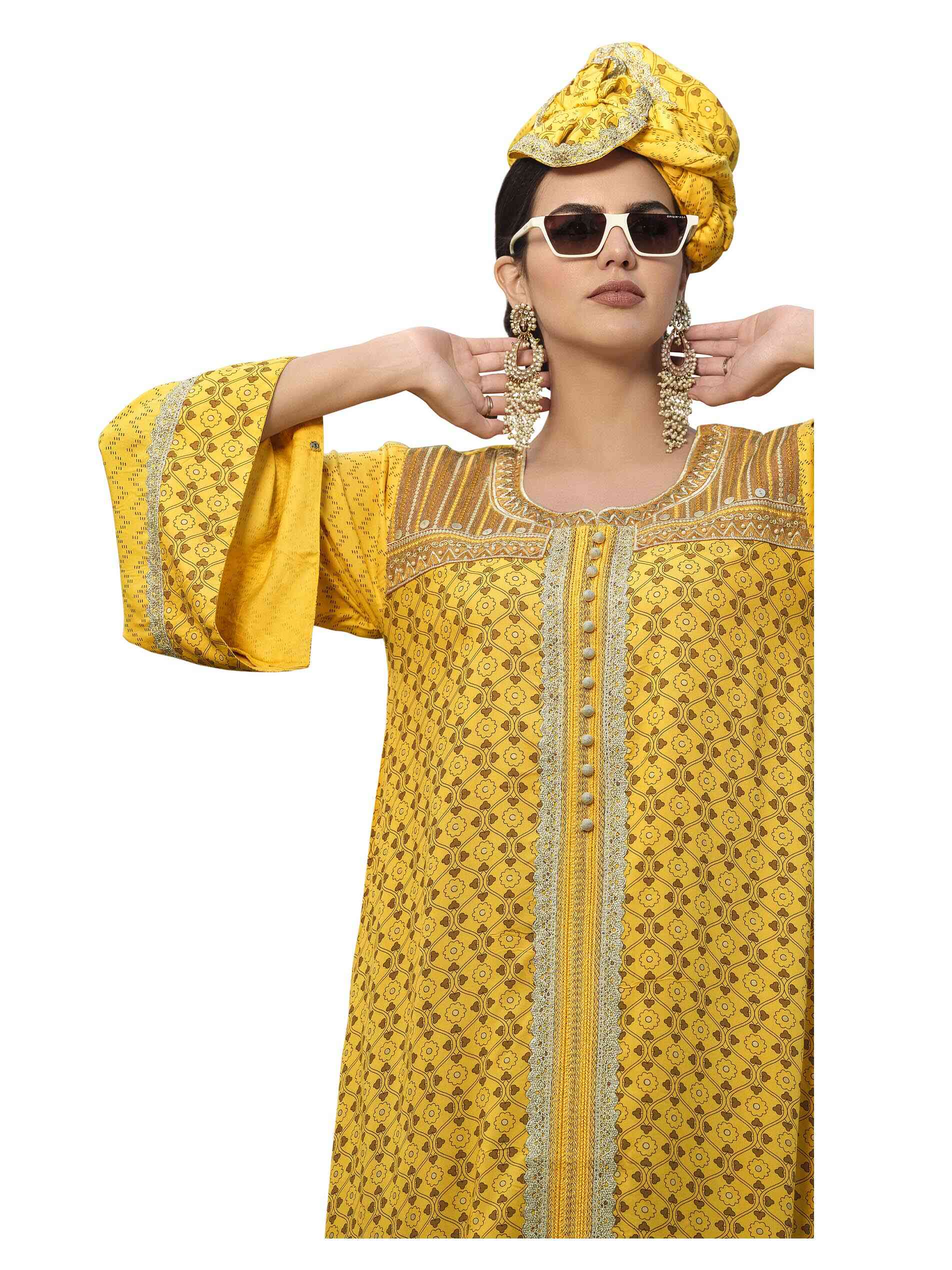 An ikat print in yellow on a full length cotton jalabiya is compelling. The daraat is designed in a sensational A line with full sleeves and round neck. The casual dress will impose an aura of brilliance as you shine this summer in a happy yellow daraat.