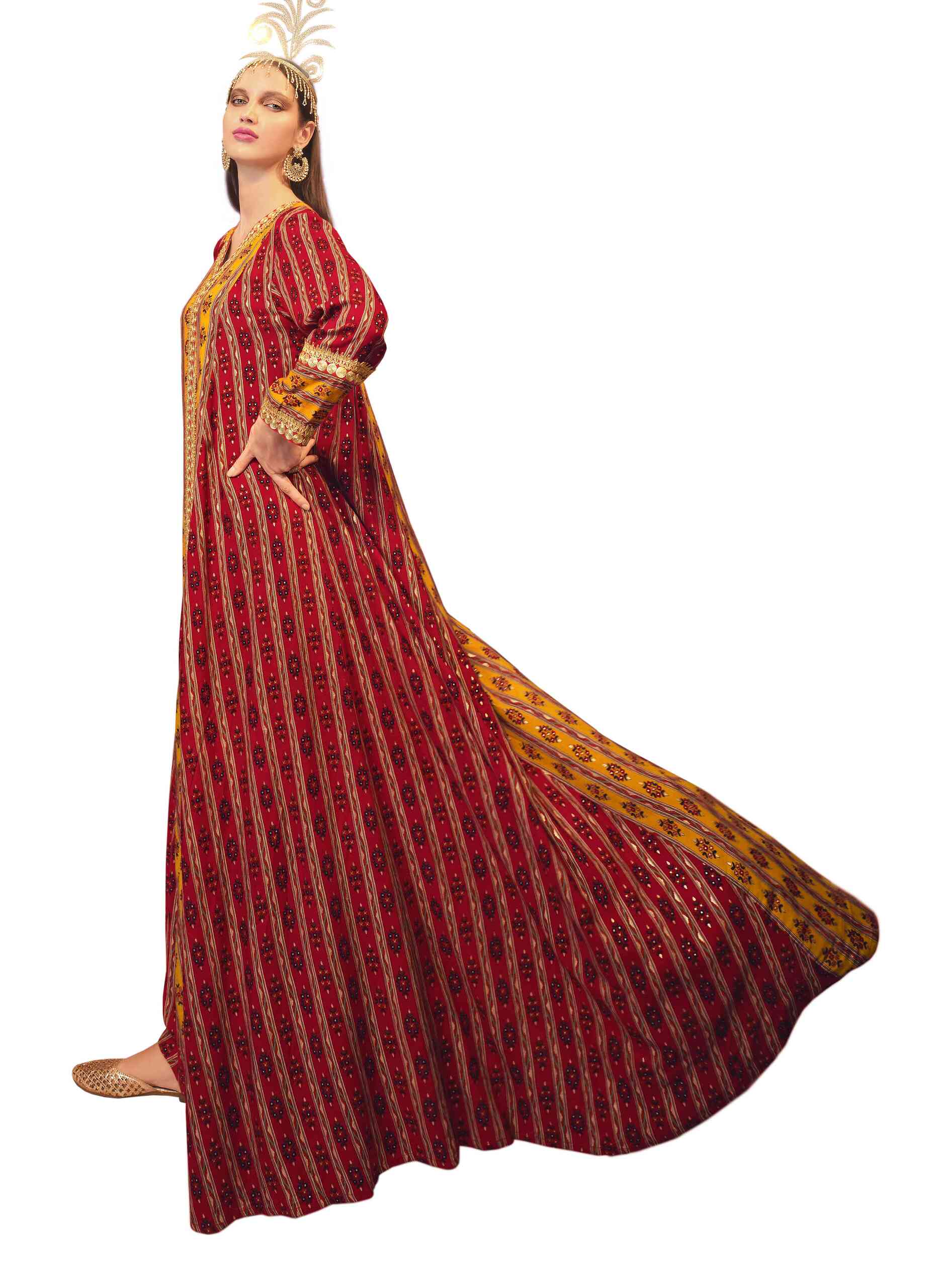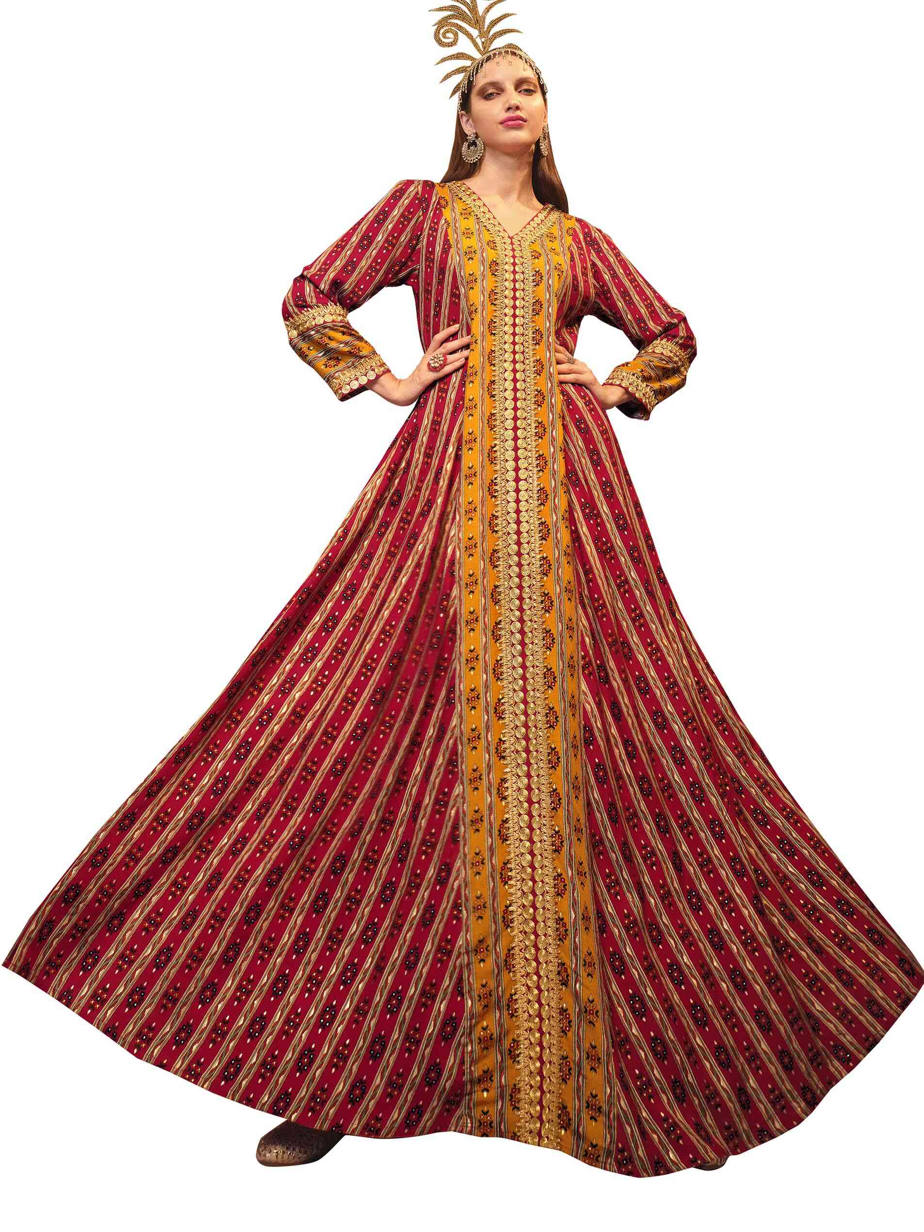 Red, the colour of love. Express your warm side in a full length red viscose jalabiya that is styled in an A line to enhance the dainty print embedded in-between printed stripes that hint orange. The V neck projects into a lovely yellow that goes all the way down emebellished with the same dainty print creating a fabulous combination of yellow amidst a sea of red. Tailored in full sleeves with the yellow printed band fringed on both sides with golden lacing to complement the golden lacing that runs round the neck all the way down the centre yellow panel. Certainly this piece evokes festivity as you revel in its decorative aura.