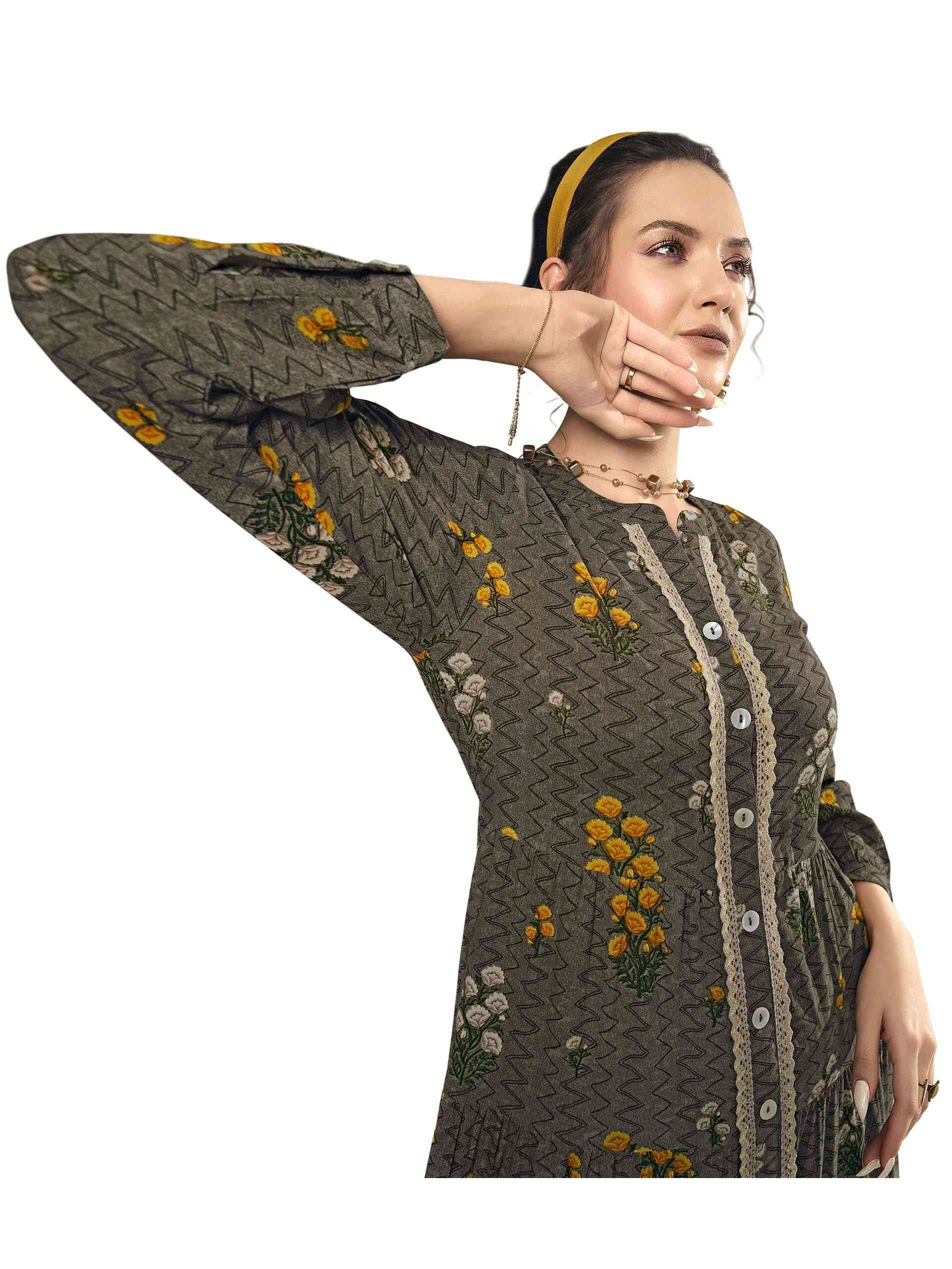 A full length of brown rayon with zigzag prints to create a mystery about you. Pretty white and yellow flowers to emit joyous vibes. This summer daraat in full sleeves is super grace with a flared hemline and V neckline with dainty lacing and buttons to create a chic and smart look.