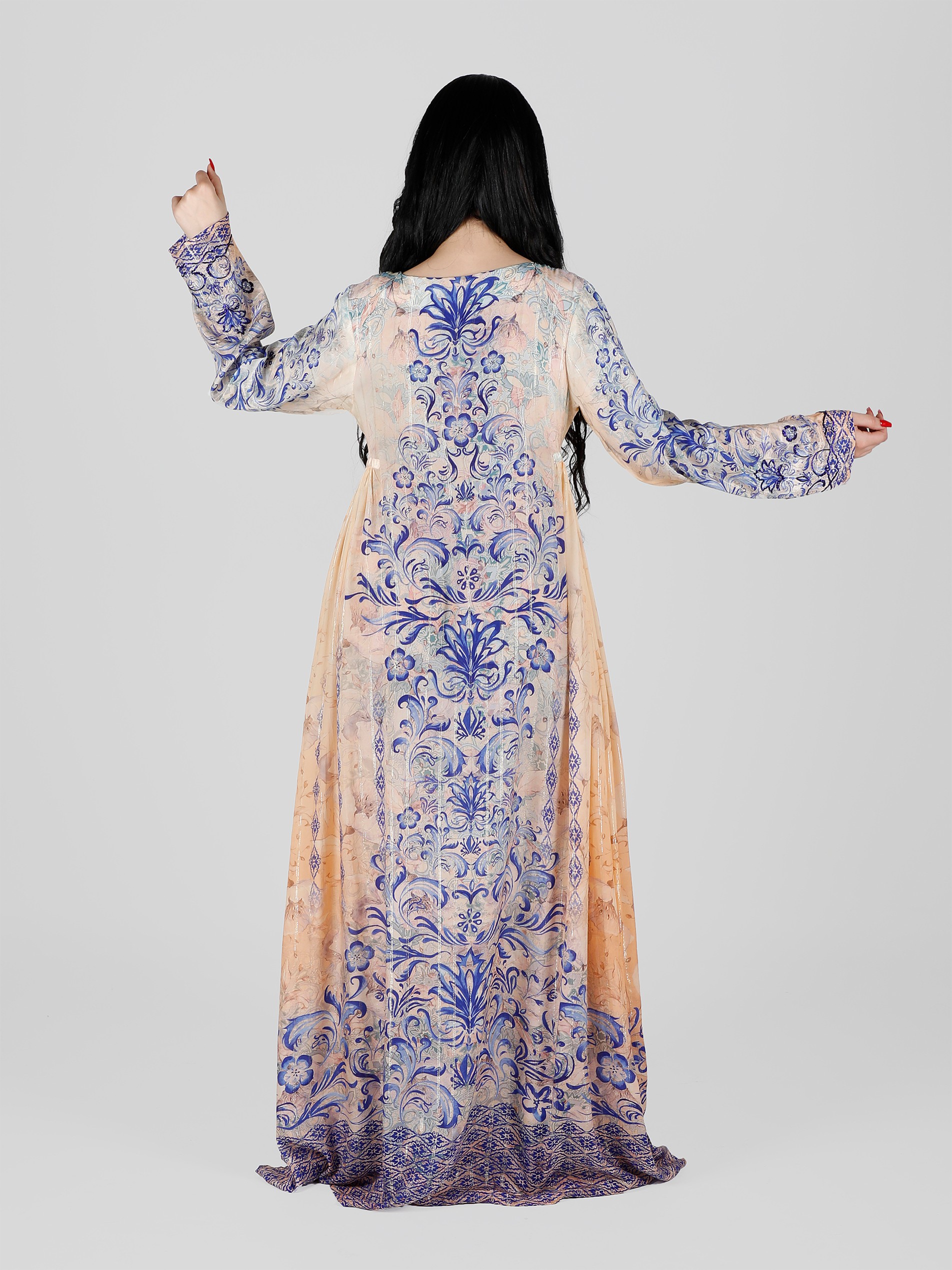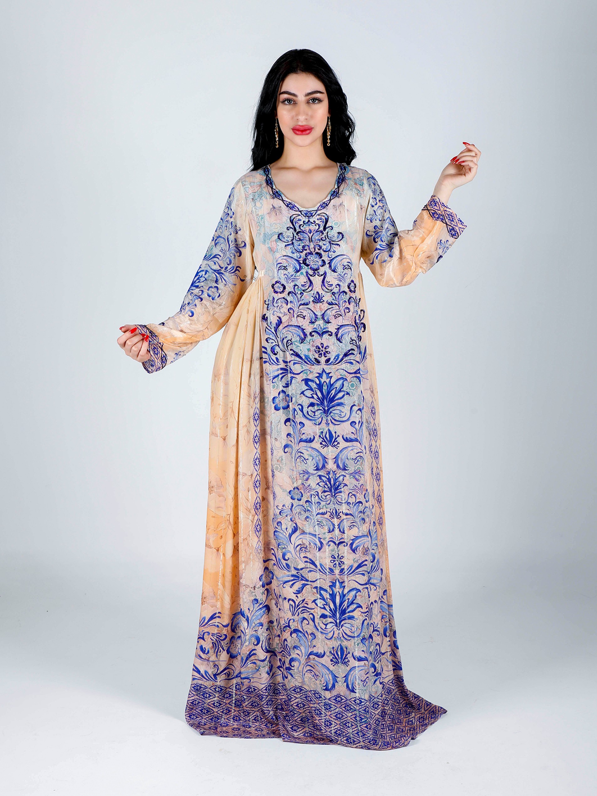 Soft viscose crepe digital printeded jalabiya with lurex and beautiful beads hand work design