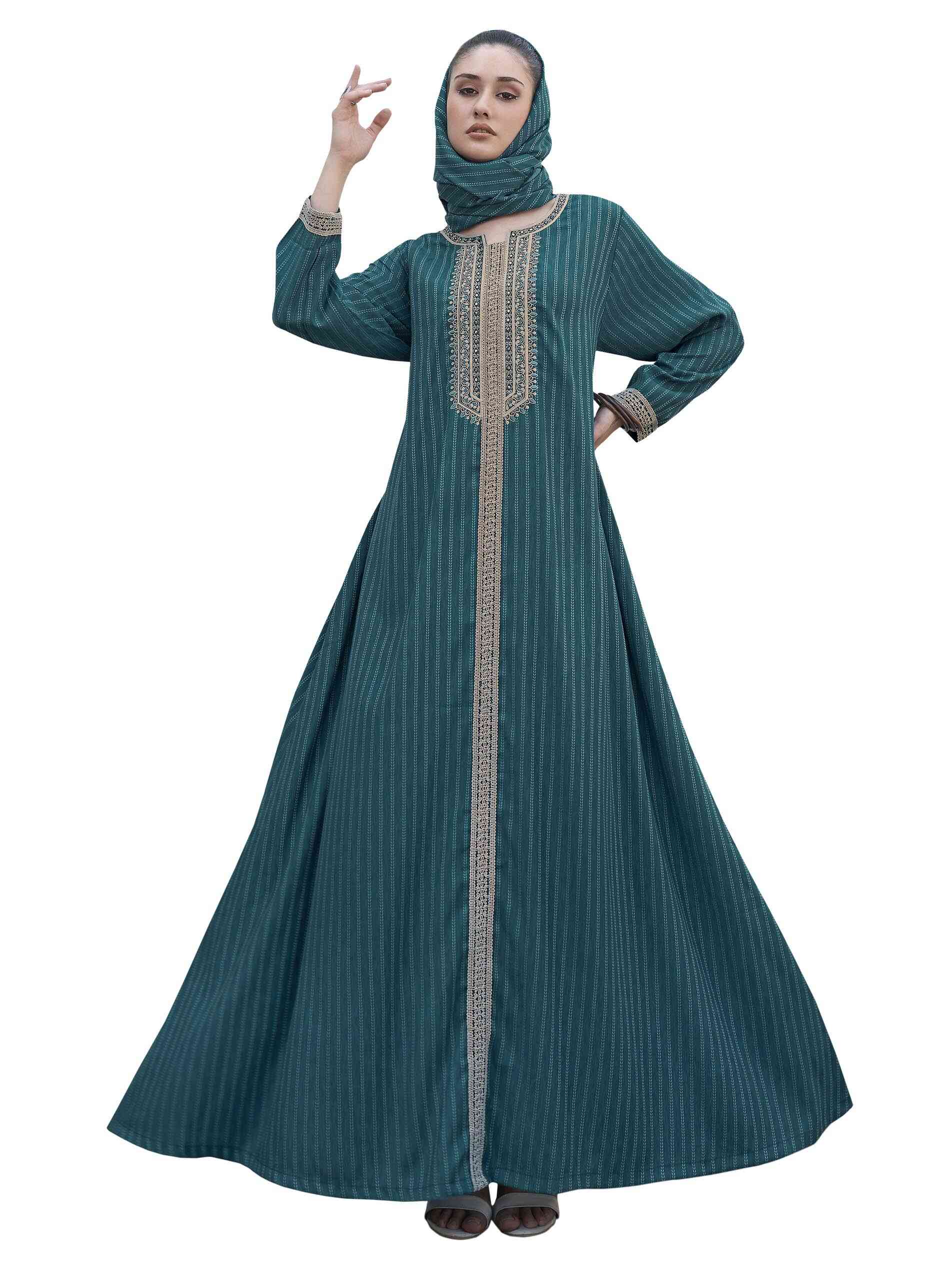 A brilliant blue to beat the summer heat in cool dressing. The blue cotton jalabiya is enhanced with rows of little bluish leaves that create an electrifying effect on the A-line styling. The notched neck is beautified with beige embroidery to erupt into a striking combination with beige lacing. The beige lacing circles the border of the full sleeves making this daraat totally desirable. Wear summer comfort that's really classy.